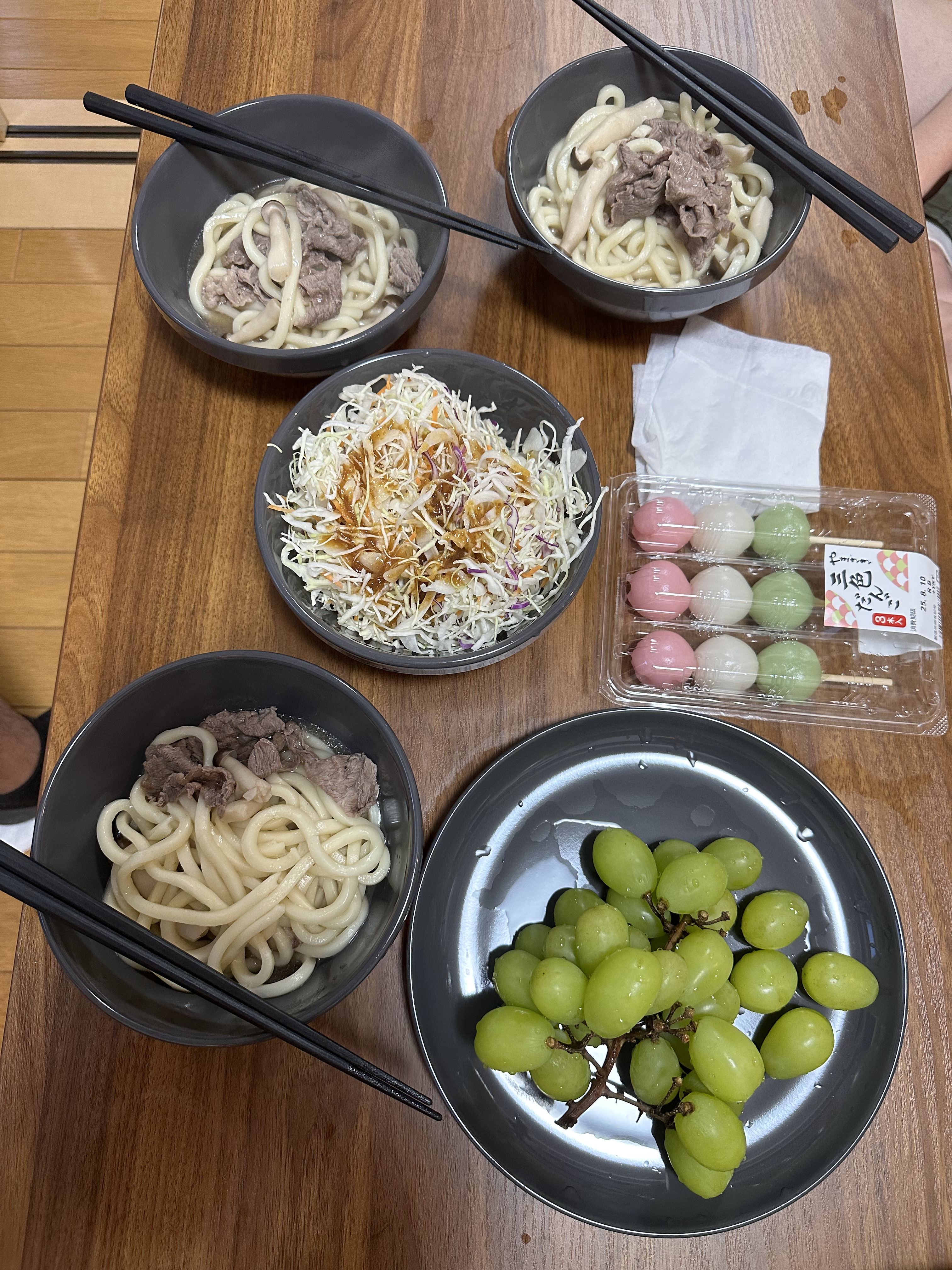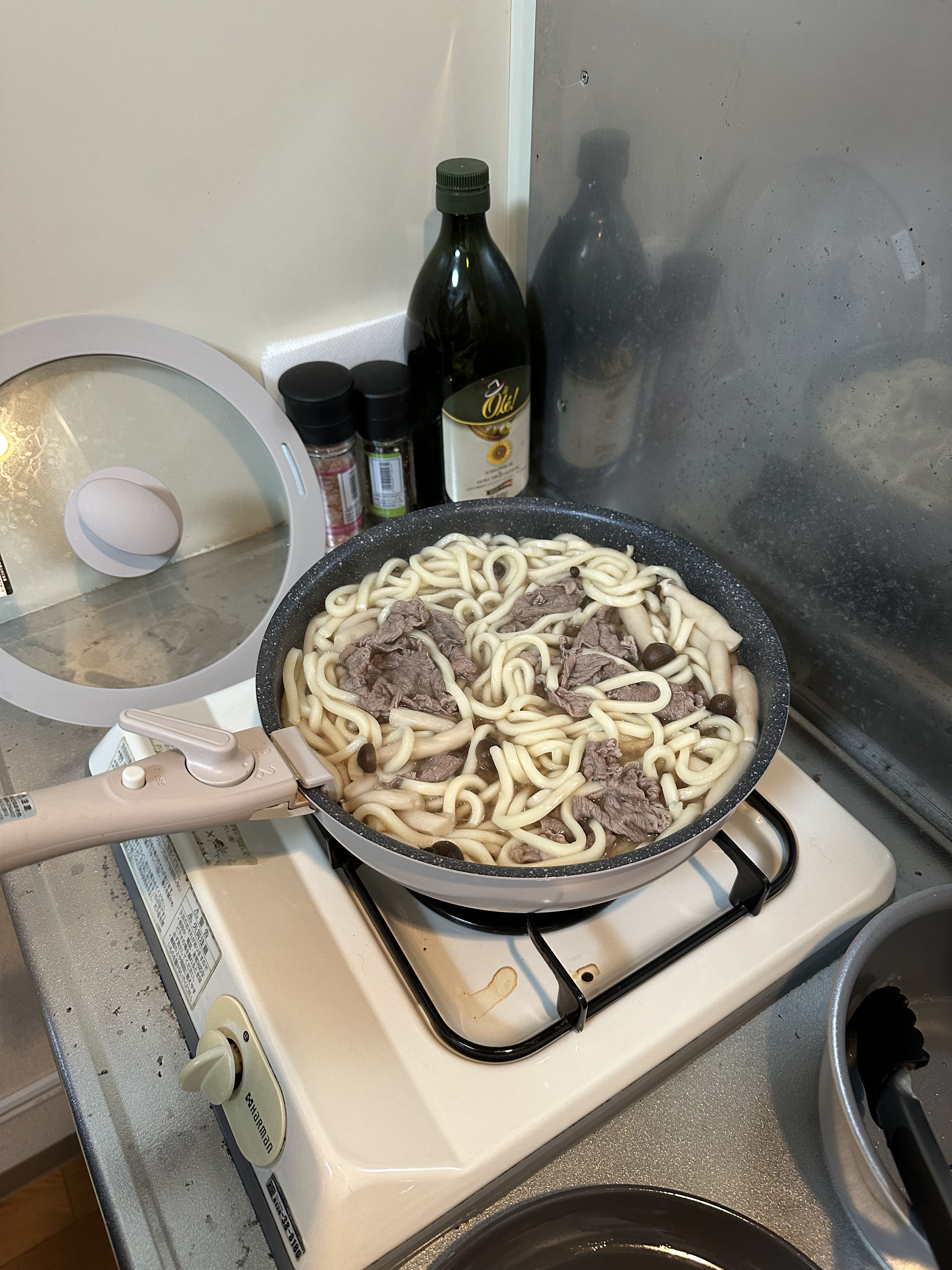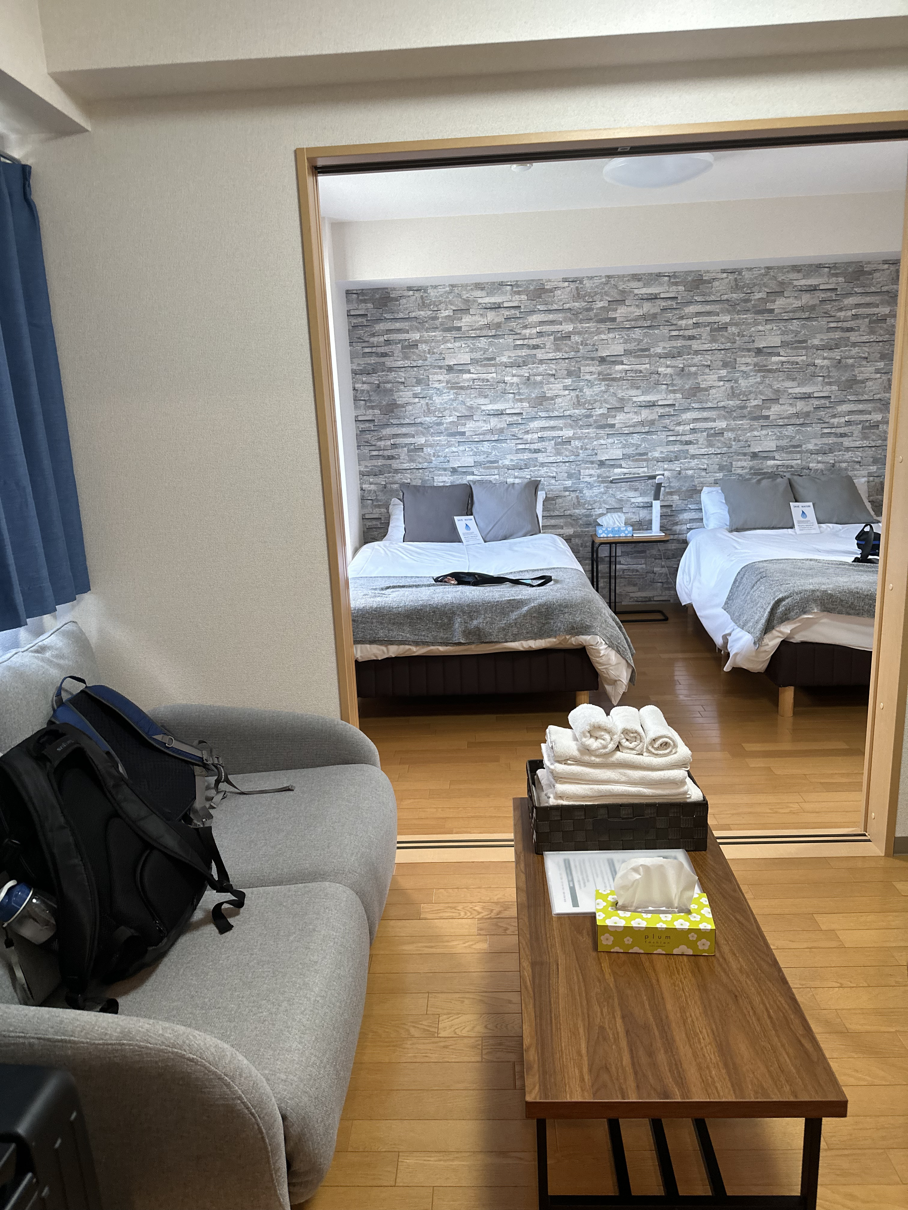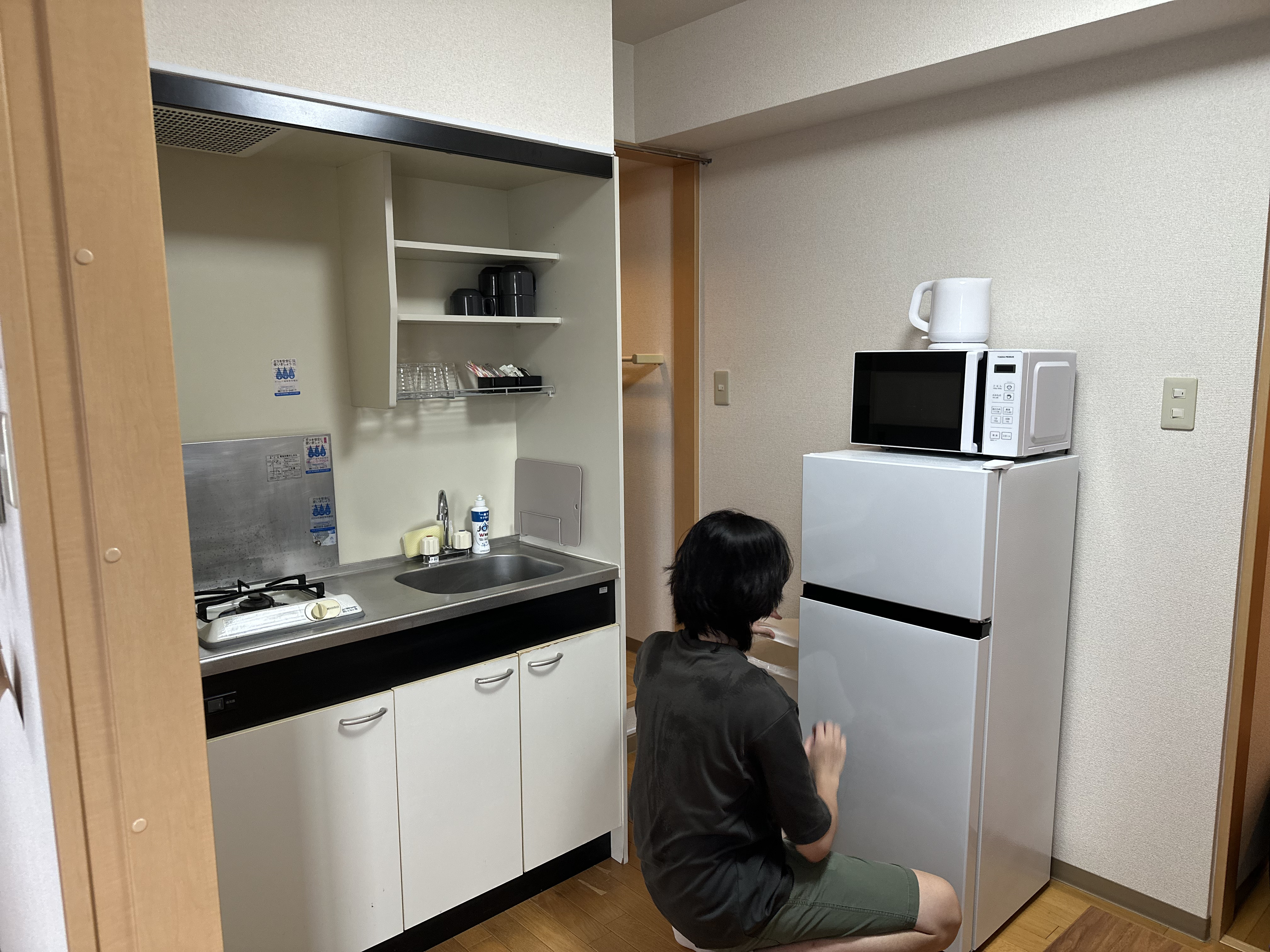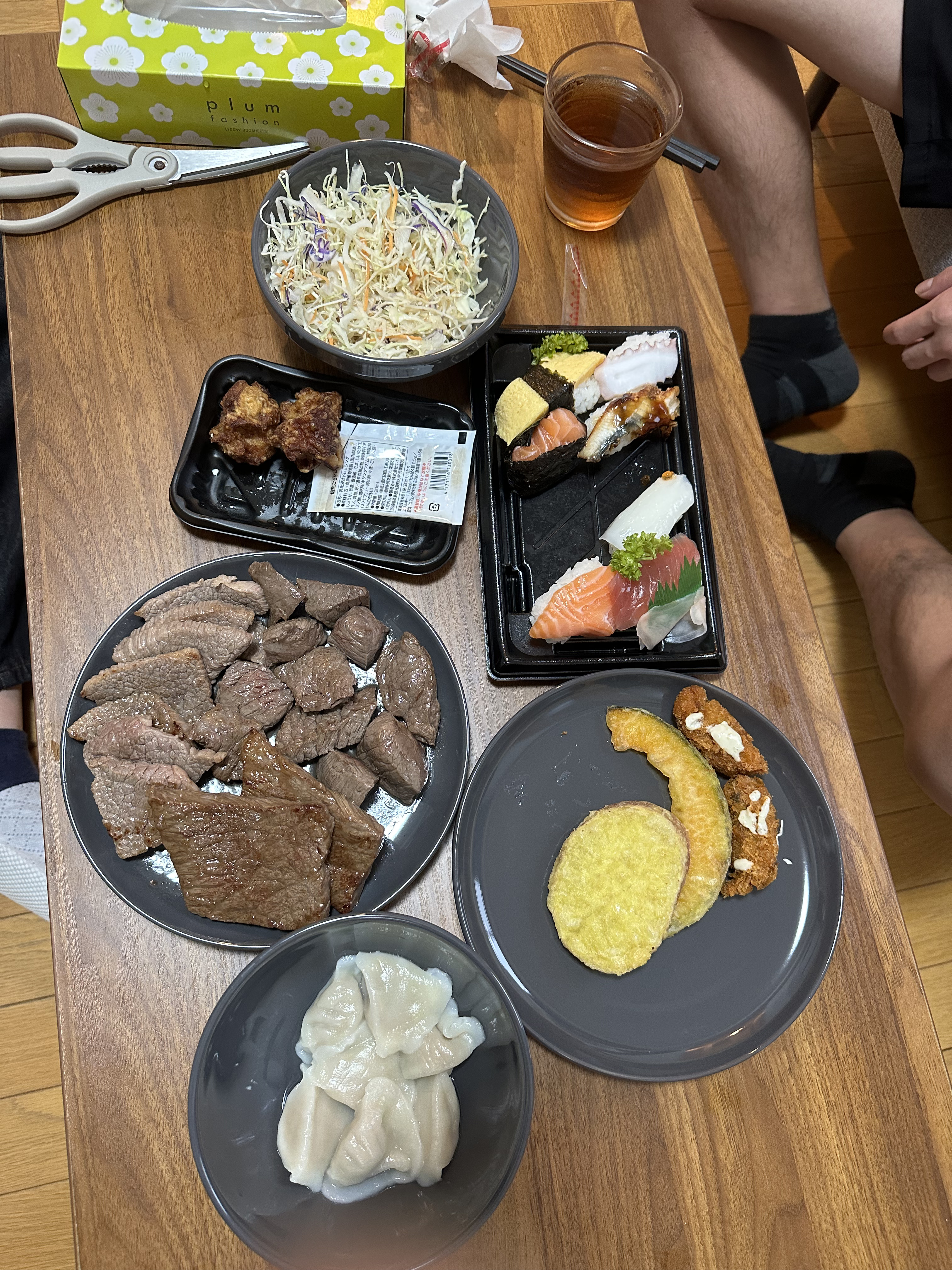 回到公寓,今晚決定煎和牛,之前看評論說抽油煙機不給力會把房間搞得都油煙味,先把房間門關上窗戶打開預備,結果還好嘛;怕吃不飽還買了便當和壽司,結果吃超飽,這一整頓三個人應該1000台幣不到,真的是有錢人才國旅