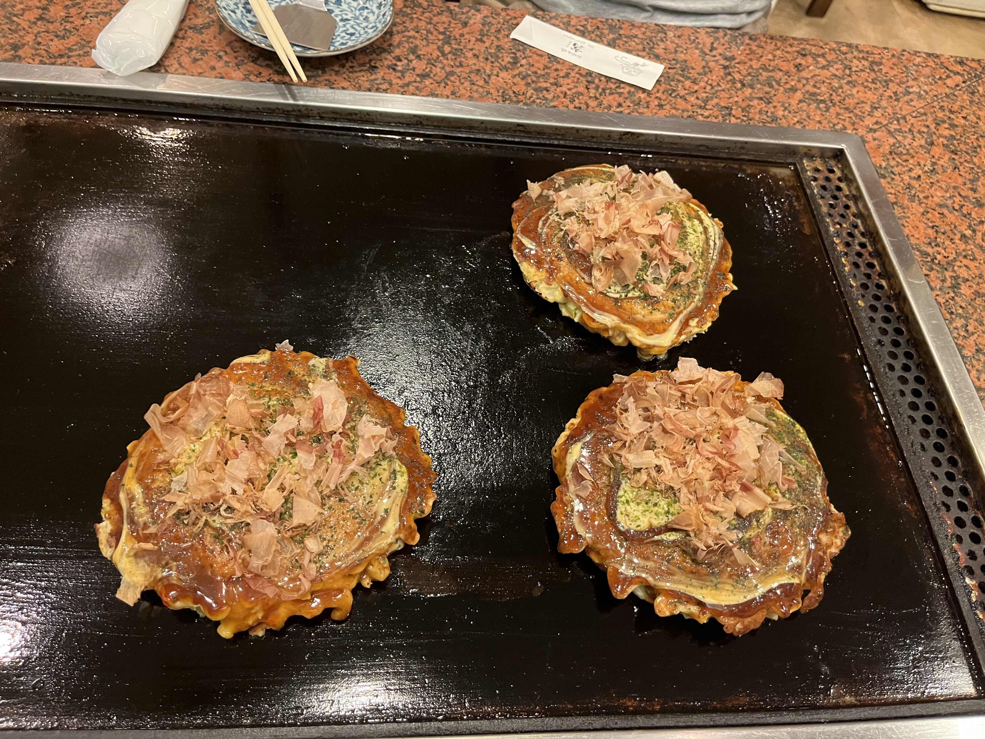 晚餐本來要吃馬肉,結果沒預約吃不到,另外找了一家大阪燒,味道普普但吃得超飽